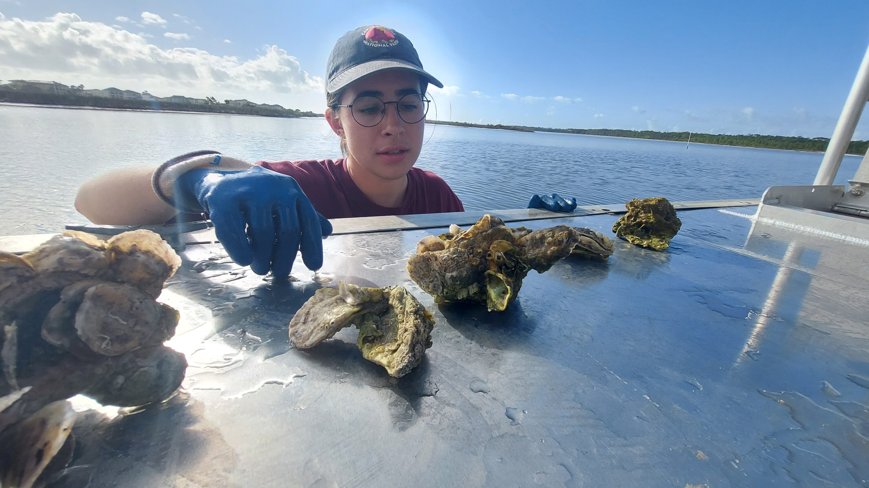 - Research Associate Lindsay Miller inspects oysters from a newly restored reef built using recycled shells. Oyster reefs improve water quality, create habitat for marine life and strengthen Alabama’s coastal ecosystem.
