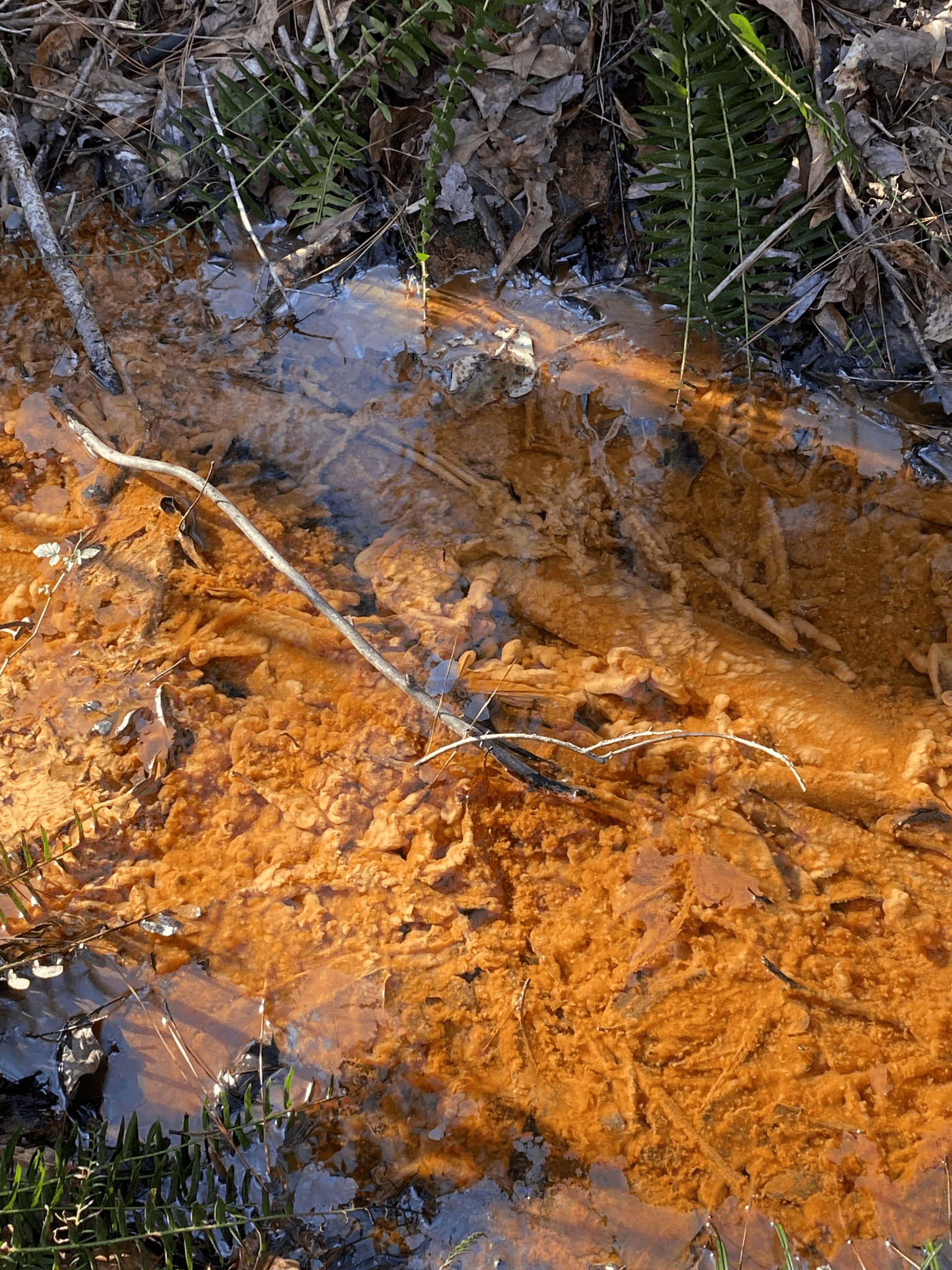 - Orange water could indicate possible construction dewatering or construction best management practices not being followed (figure 12). Orange could also indicate iron floc—also known as iron flocculent—which is not an illicit discharge but a natural phenomenon caused by iron-oxidizing bacteria that commonly occur in waterbodies near iron-rich soils in Alabama and the Southeast. Iron floc appears as an oily-orange slime substance on submerged rock or wood (figure 13).