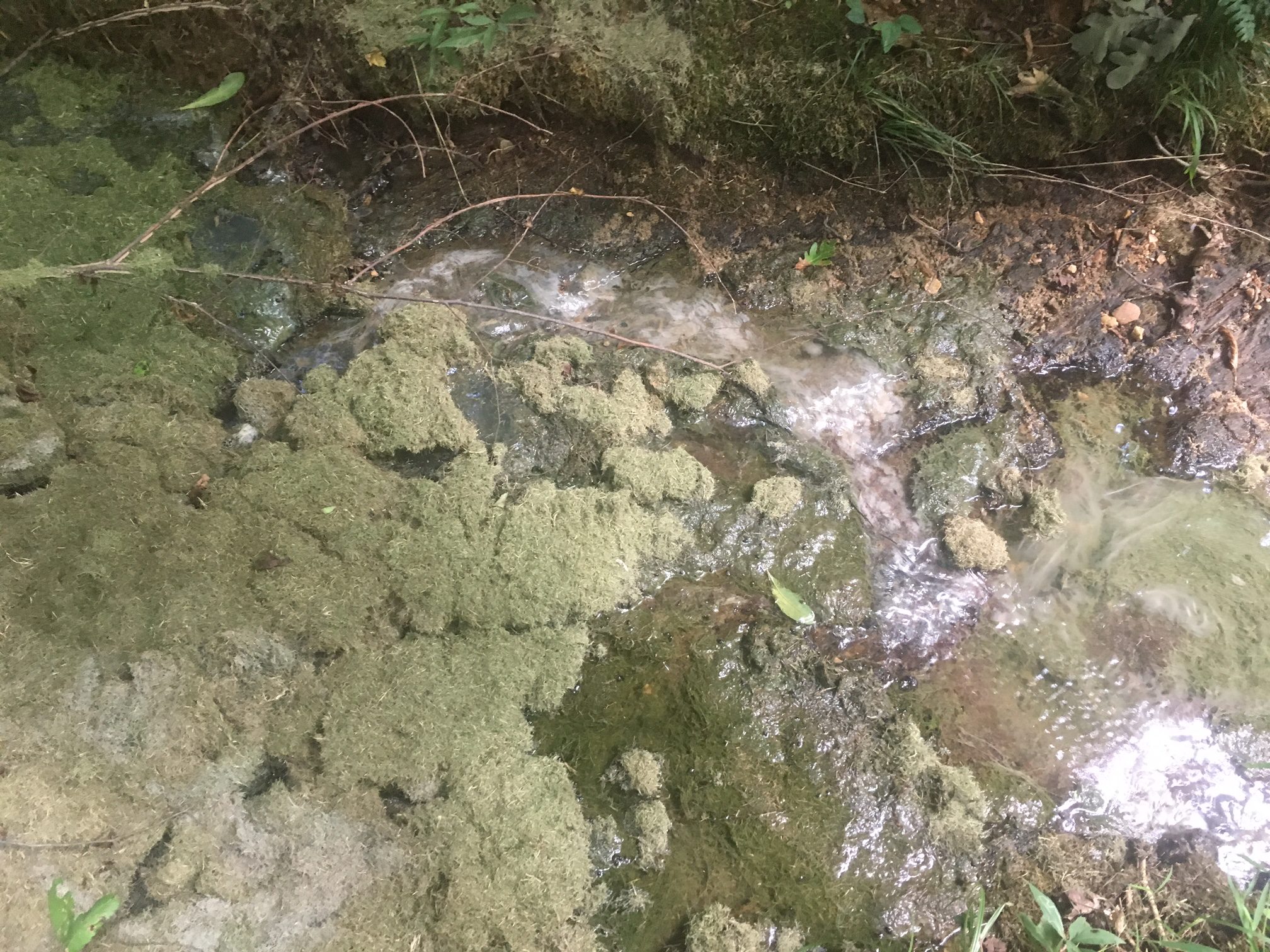 Growth and staining. Excessive algae growth is sometimes an indicator of an illicit discharge causing excess nutrients to enter the waterway, likely from fertilizers, sewer overflows, or failing septic systems (figure 15).
