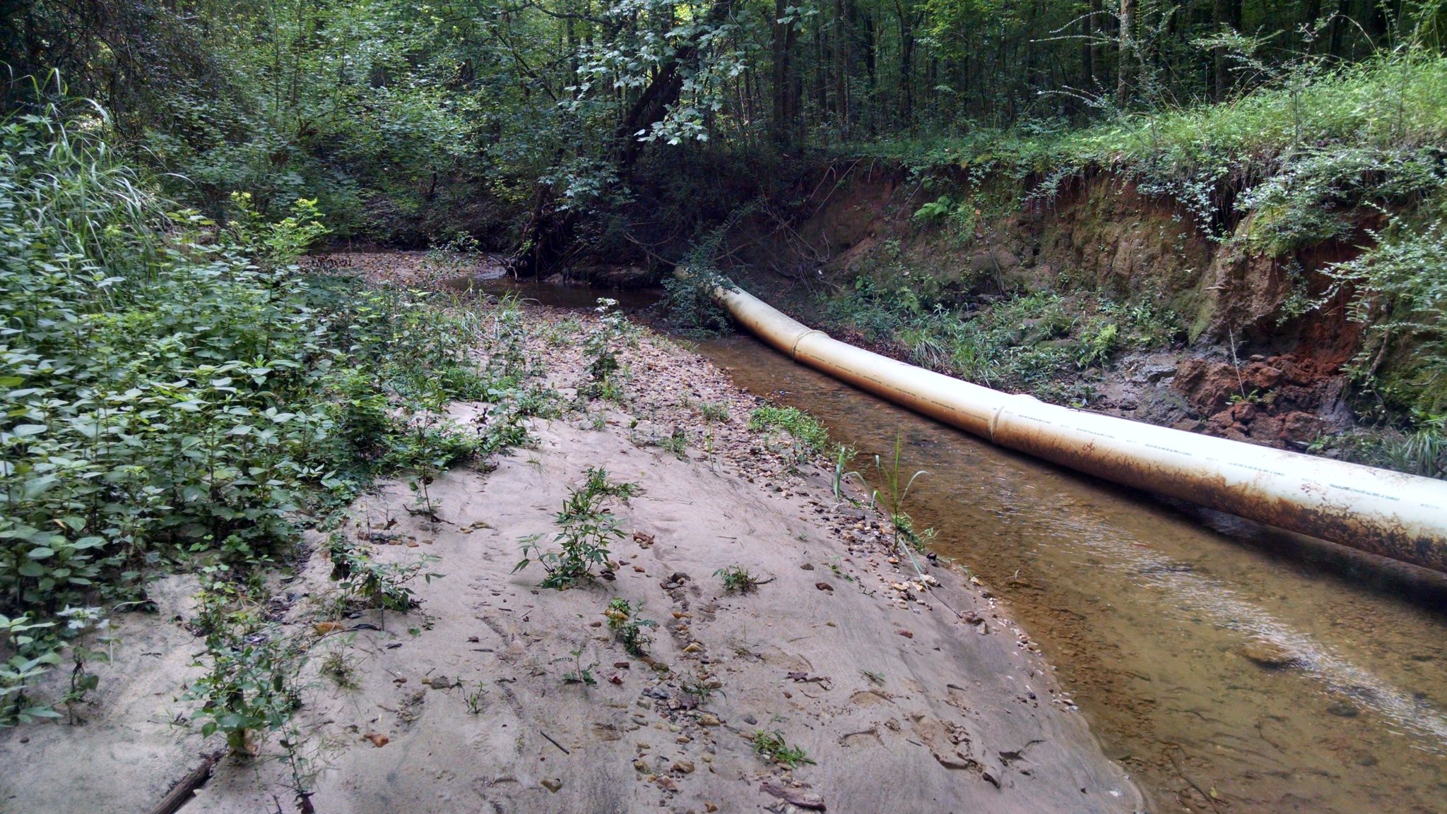 - Figure 7. Exposed sewer line due to widening waterbody bank erosion. (Photo credit: Dusty Kimbrow, Water Resource Management, Watershed Program Coordinator)