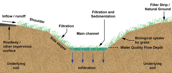 Grass-lined swales direct and filter stormwater runoff and reduce erosion. This illustrates a typical cross section and its stormwater treatment processes. Image used with permission, NCSU-BAE (2020). Ekka, S. & Hunt, B. Swale Terminology for Urban Stormwater Treatment (AG-588-26).