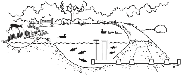 Wildlife, both game and non-game, require food, water, and shelter to survive. If managed properly, ponds can provide fishing along with food and shelter for a variety of wildlife species. The upper reaches of a pond can be managed for wildlife, while the lower areas adjacent to the dam have the characteristics of a typical fish pond. No more than approximately half of the pond area should have water less than 2 feet deep.