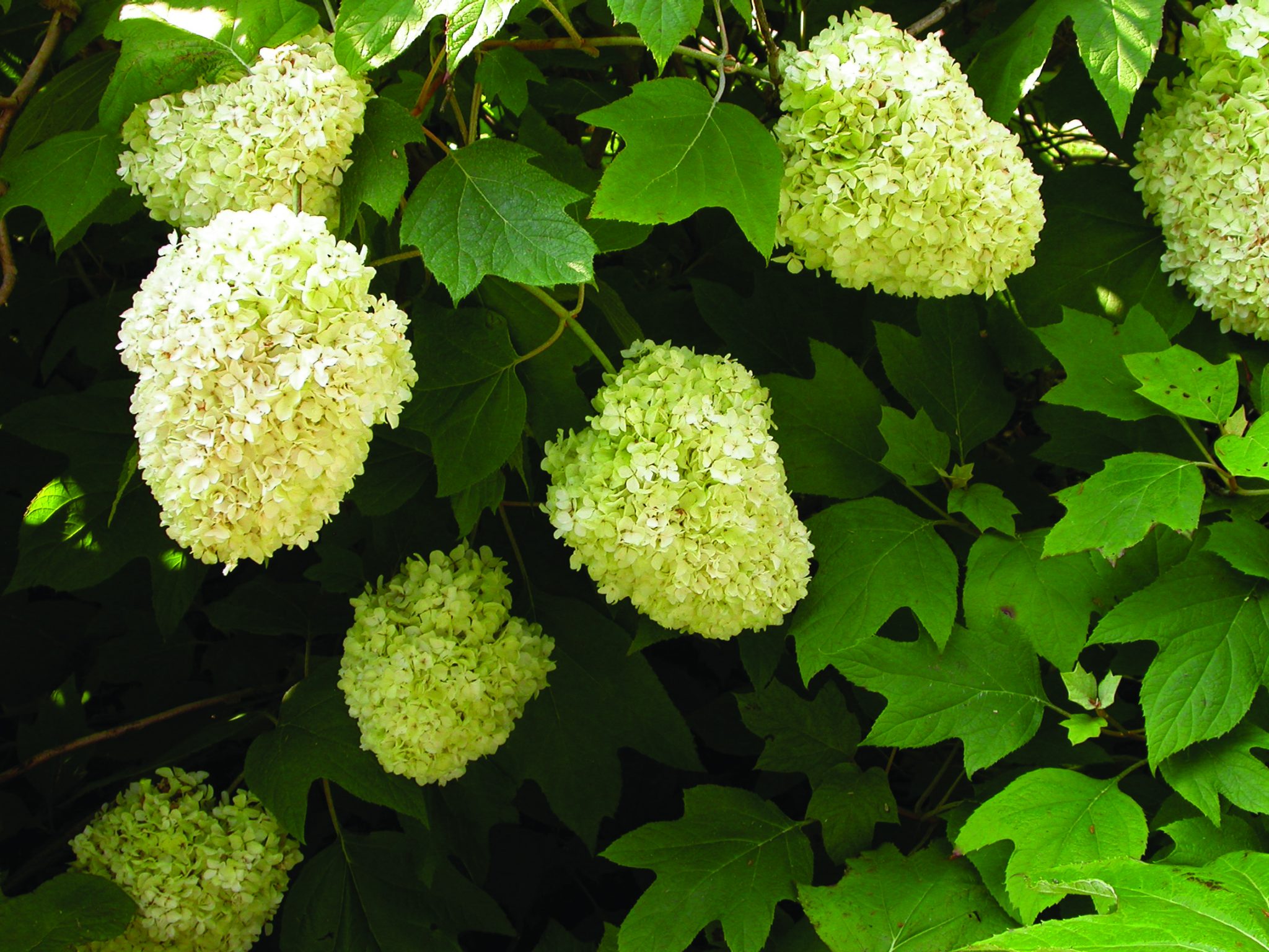Culture and Pruning: Can grow in partial sunlight; light or deep shade; perhaps the most reliable of the hydrangea group; colonizes by underground stems; moist, well-drained soil; tattered leaves appear in drought; pruning after flower will often initiate rebloom. Note: Reblooms—blooms on old and new wood in same season; blooming early summer and again in fall.