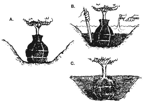 Figure 1. (A) Place plant in center of hole. (B) Fill sides one-half to two-thirds to the top of the ball and firm the soil. (C) Finish filling the hole, and cover the planting area with 2 inches of mulch.