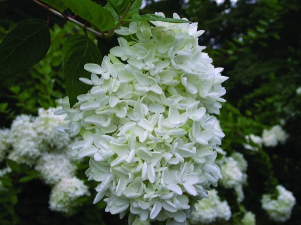 - ‘Snowflake’ has double florets in 12- to 15-inch conical flower clusters; clusters may droop from weight; prefers afternoon shade; plant is 8 feet high and wide; originated at Aldridge Nursery in Bessemer, Alabama.