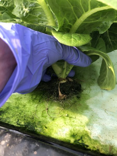 It is important to monitor the quality of water that is recirculated within the production system, particularly in systems that use DWC or NFT designs where the edible portion of the produce is in close proximity to the water source. Water temperature, acidity, pH, and the presence of a nutrient source can influence bacteria growth within the system. Monitoring microbial water quality and adjusting it accordingly can help to mitigate pathogen growth. Cleaning the system components between harvests by removing dead roots, plant matter, and algae helps to eliminate nutrient sources for pathogens to grow. Additionally, recirculated water can be treated with EPA-approved antimicrobial pesticides (i.e., chlorine, peroxyacetic acid) or nonchemical methods (i.e., UV-C light system).