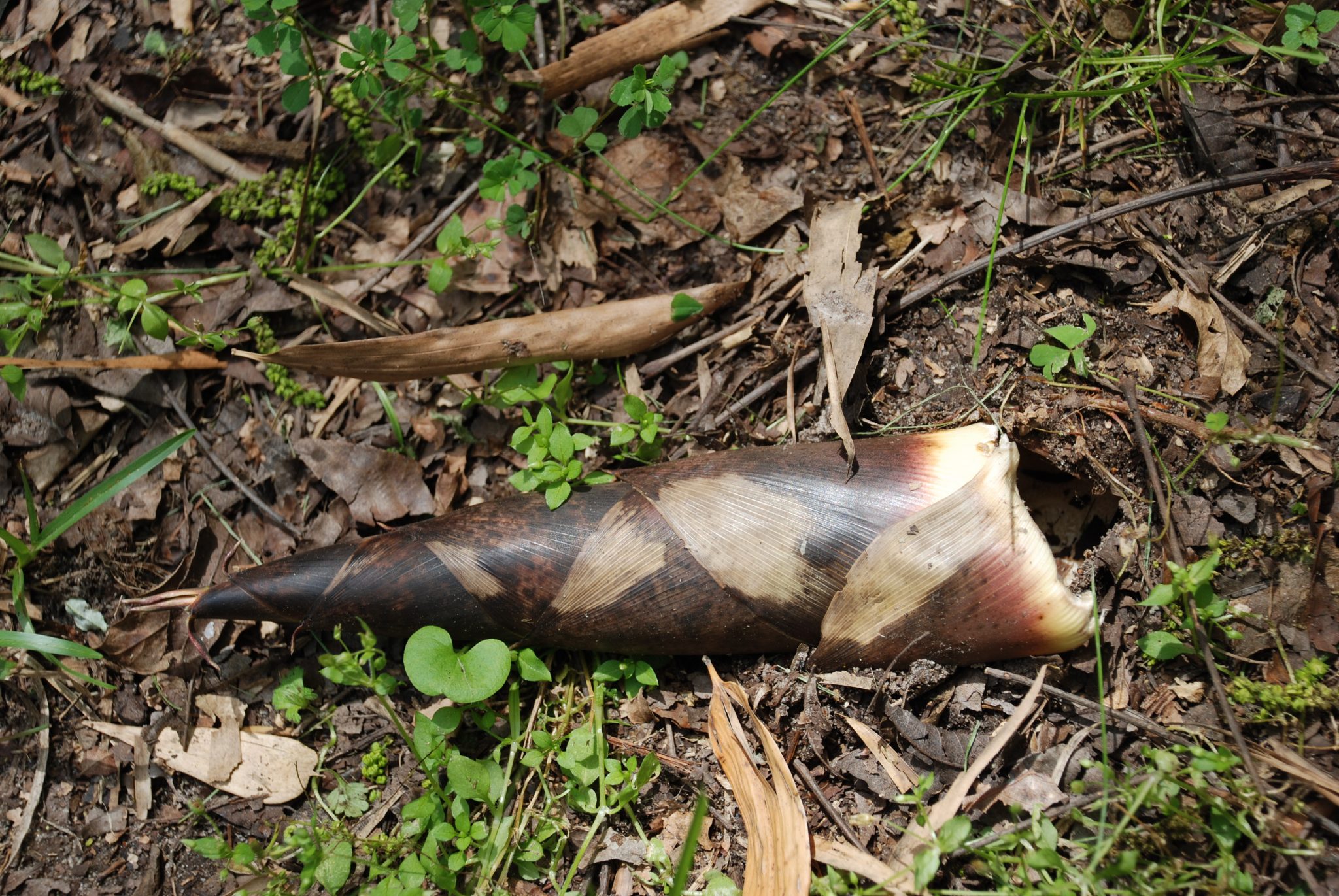 Young bamboo culms have a high water content, making them relatively fragile and easy to remove by simply knocking them over (with a kick, shovel, etc.) or cutting with a string trimmer (figure 4). New culms do not emerge at the same time, so mowing or removal must continue until no new shoots emerge. The length of time may depend on the species of bamboo, health and age of the grove, and weather conditions.