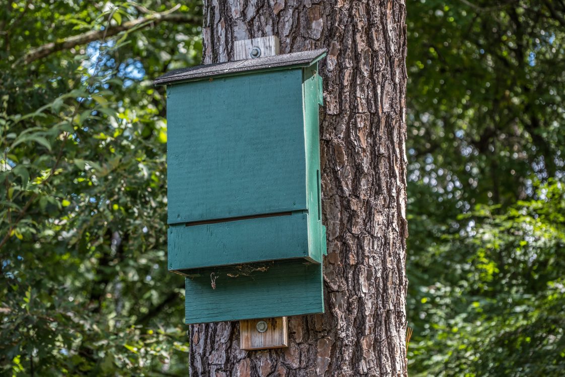 Bat species show differences over where they roost—or make their home—and how solitary they are most of the year. Some bat species such as the big brown bat and the Mexican free-tailed bat (figures 1 and 2) are more likely to live in caves, buildings, or human-made bat houses (figure 3), whereas other species such as the eastern red bat (figure 4) and hoary bat are more solitary and will likely live in forested settings. In Alabama, solitary bats may decide to roost in tree hollows, under peeling tree bark such as the shagbark hickory (figure 5), or even in leaf litter (figure 6).