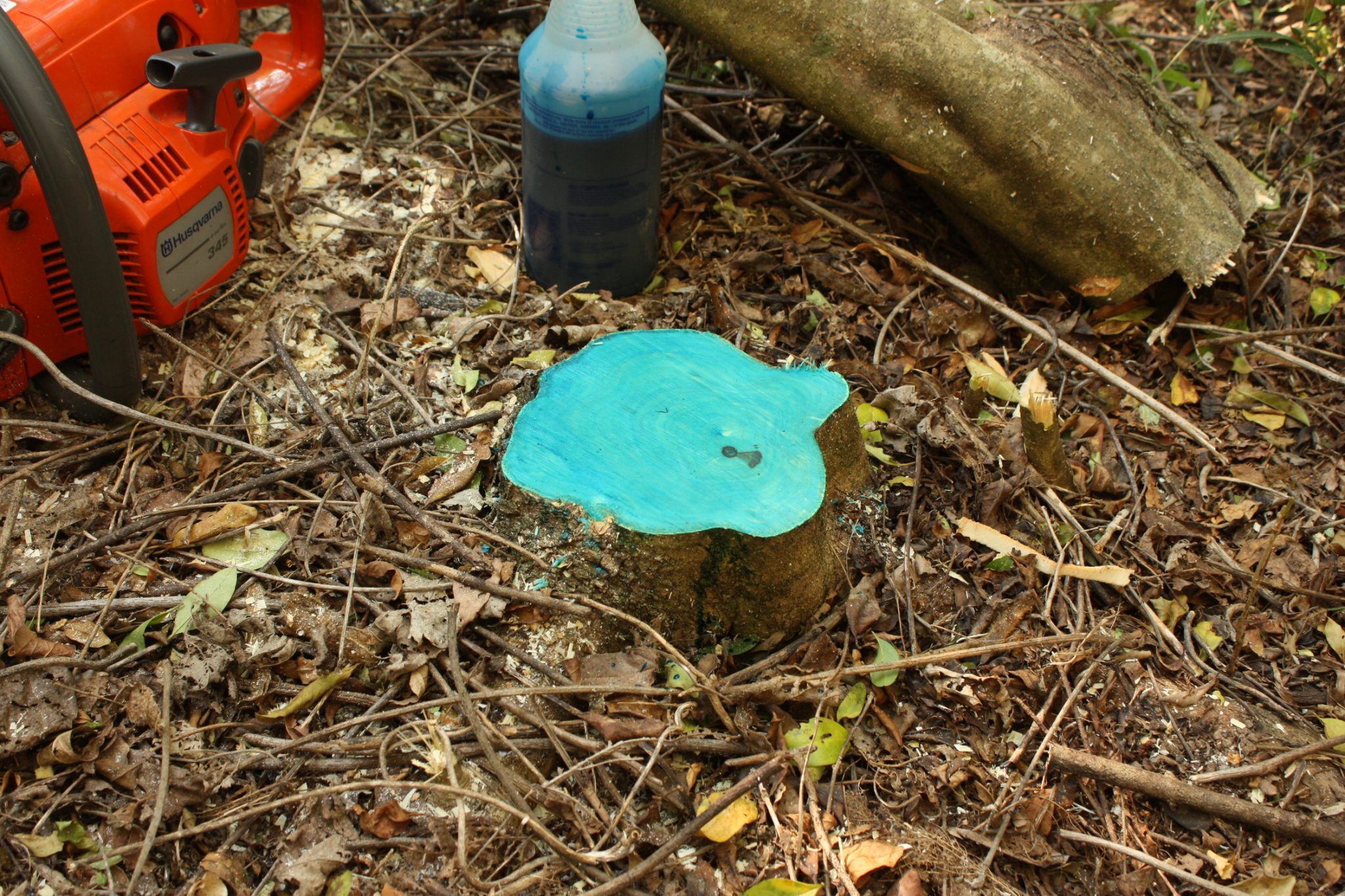 Both water- and oil-based cut stump treatments work on any size privet, but it is critical to treat every cut stem. Untreated cut stems will sprout. Cut stump treatments can be done almost any time of year, but late fall is the easiest from an operational standpoint. The only time cut stump treatments should not be done is in the early spring when privet shrubs are experiencing strong upward sap flow. This is evident when stumps appear to “bleed” water following cutting.