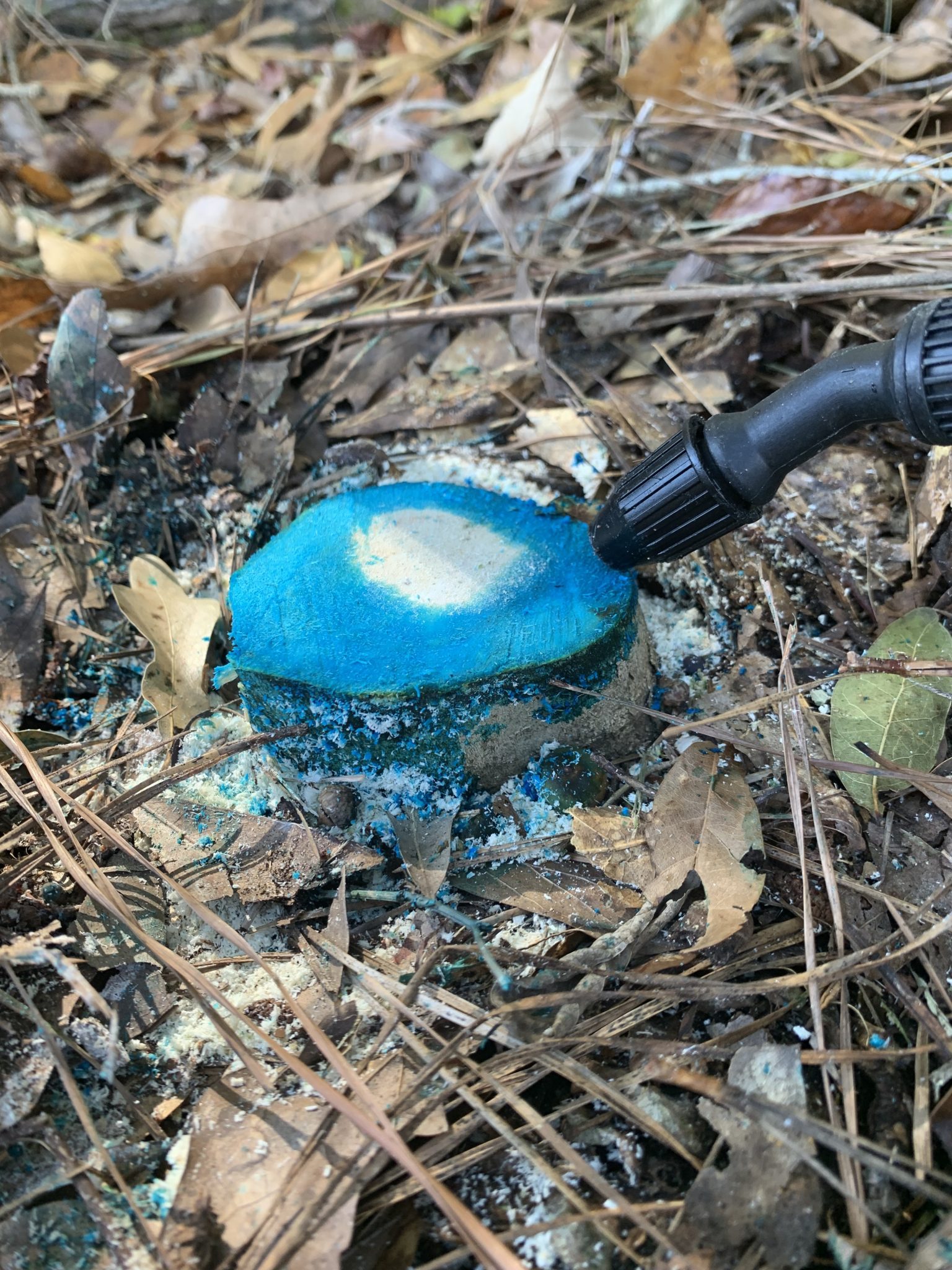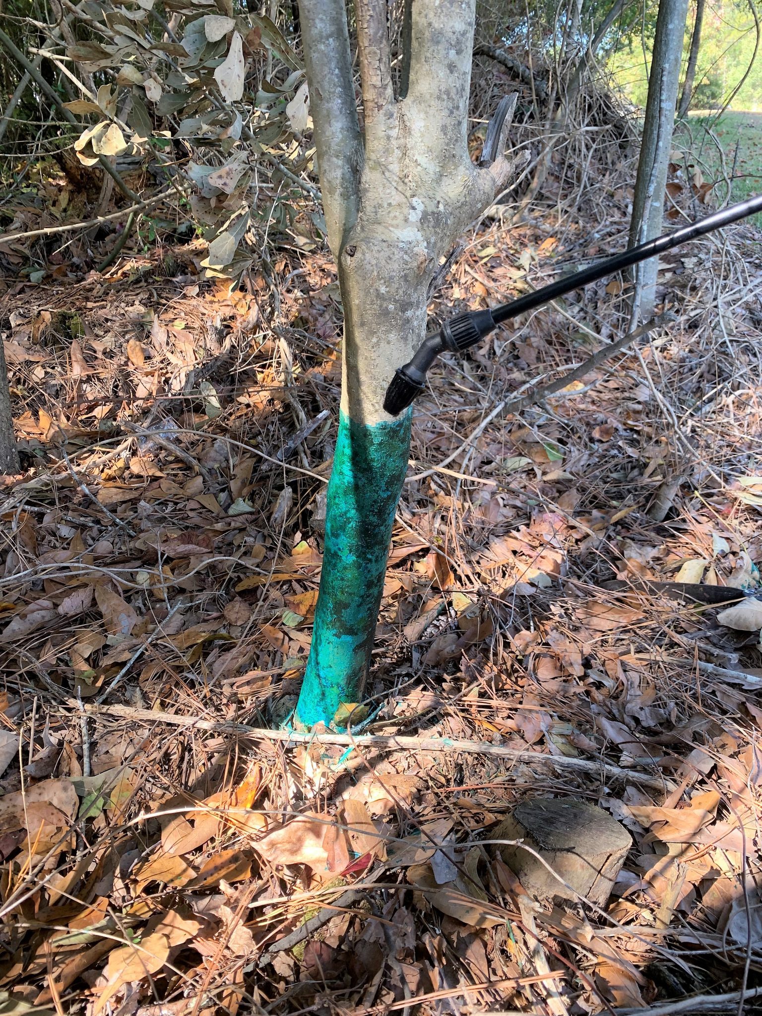 Cut stump, basal bark, or hack-and-squirt treatments are also effective on Chinese privet and can be applied throughout the year. These methods are often preferred on larger plants or if they occur adjacent to sensitive species that need to be protected from collateral damage. These individual plant treatments (IPT) may arguably be more successful if done November through February in Alabama. As a perennial woody shrub/tree, sap flow usually concentrates in the roots for the winter and then rises again in the spring. If these concentrated herbicide treatments are made during the fall, herbicides can naturally translocate into the plants’ system for a more effective kill. The thin bark of privet also allows easy absorption of these herbicide products when combined with a basal oil as a carrier.