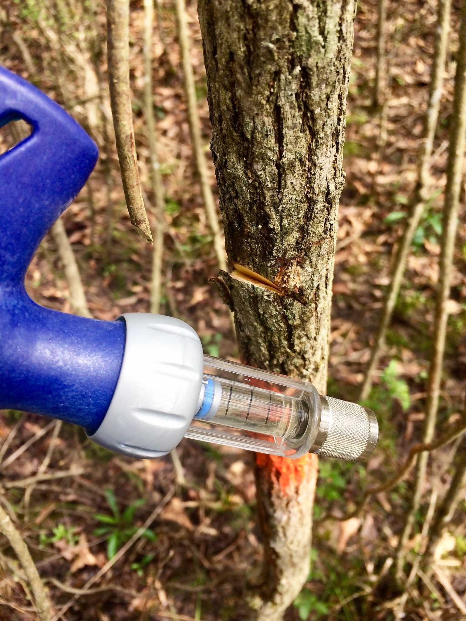 - Figure 2. Hack-and-squirt treatments are a good option for stem diameters less than 6 inches. A livestock dose gun helps administer the exact amount of product per hack.