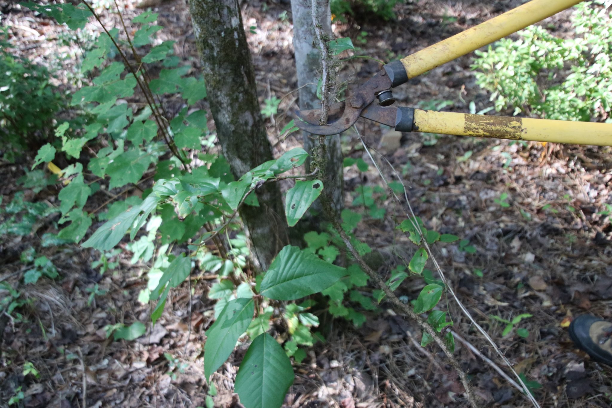 Another common vine that often can be a headache and also cause a terrible rash is poison ivy. Although a native plant with many wildlife benefits, its sap contains a chemical called urushiol, which causes the terrible itching and blisters associated with poison ivy. Poison ivy growing on the ground can easily be sprayed and controlled. If you take the time to look up the trees surrounding your property, more than likely you’ll see larger poison ivy vines climbing the tree trunks. These larger vines produce more poison ivy seed and attract more birds that spread the seed. For long term reduction in poison ivy, it’s a good idea to treat these vines. However, the chemical urushiol exists in all parts of the plant including the stem. Cutting the stem and treating with a herbicide is highly effective but more care must be made to avoid throwing dust or chips of the stem back towards your body. Pruning shears or lopping shears are two tools that you can use to cut the stem without dispersing urushiol into the air.