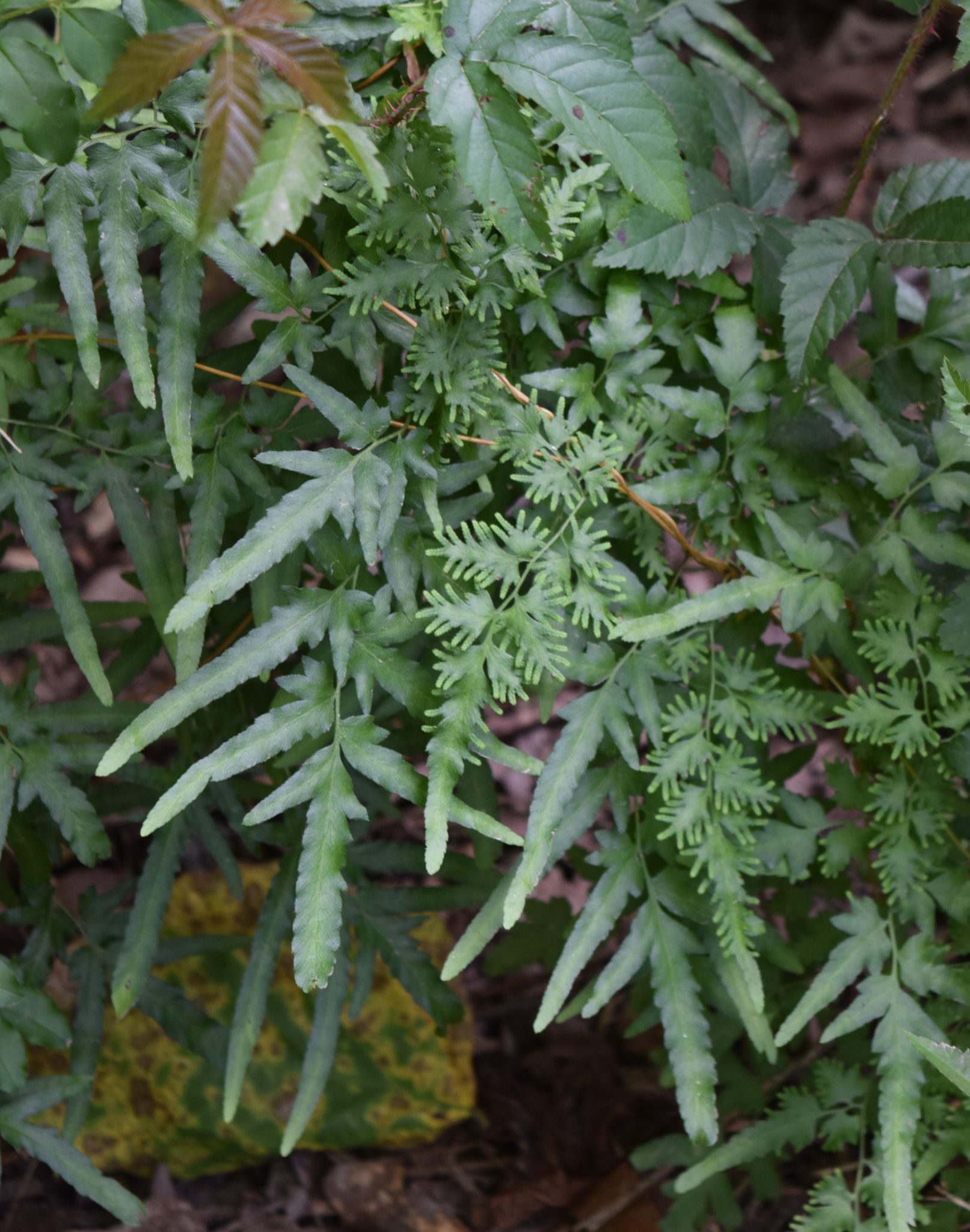 A perennial twining vine, Japanese climbing fern can grow to 90 feet, climbing into and over trees and shrubs or trailing along the ground, creating dense mats (figure 1). Stems (technically a rachis) are thin and wiry but difficult to break; they range from green to tan or reddish to almost black.