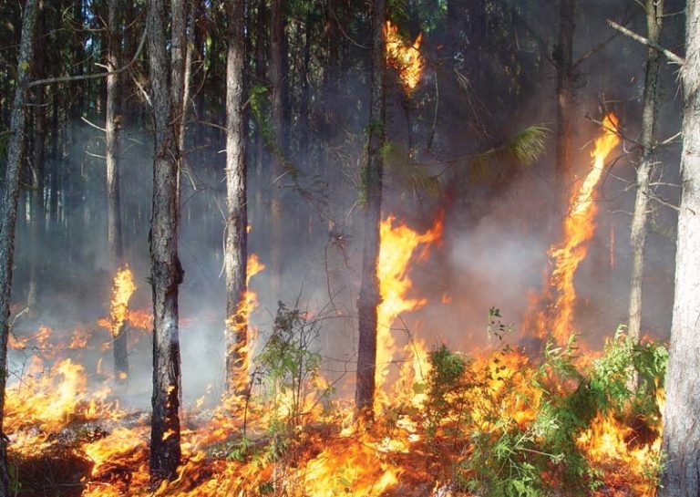 Japanese climbing fern also poses a fire hazard. Vines climbing up tree trunks create fuel ladders, which can carry fire into the canopy of trees (figure 6). The resulting crown fires can be much more damaging than ground fires. Fuel ladders are especially problematic in forest plantations where prescribed fire is a common management tool. Another concern is that low-intensity fires may promote the growth and establishment of Japanese climbing fern.