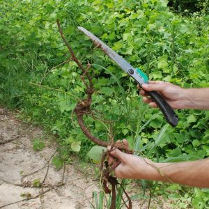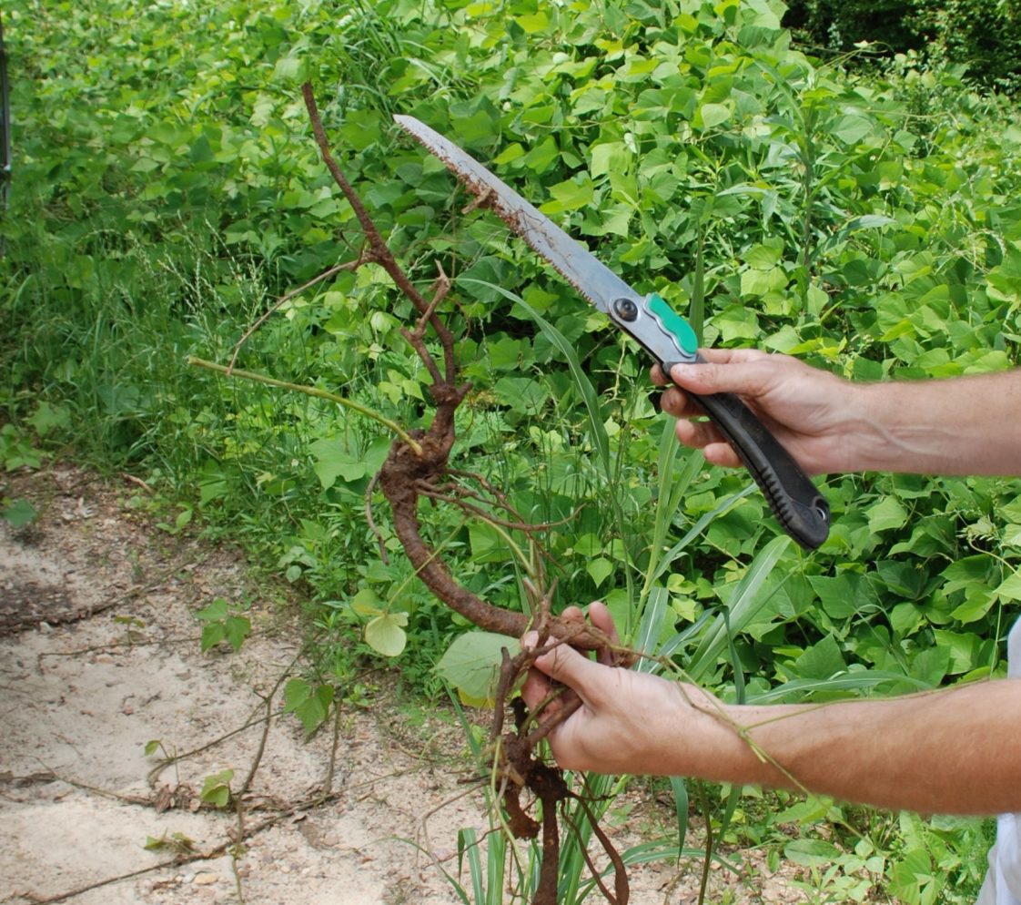 To stop new kudzu vine growth, cut just below the root crown and remove it from the soil (figure 4). Kudzu cannot regrow from below the root crown and does not sprout from lateral roots. Sometimes, vines may be buried under a few inches of organic matter and leaf litter. This gives them the appearance of lateral roots, but they are not. Buried vines can root, making control more difficult because these hidden vines may produce many new shoots.