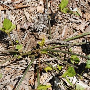 No, you do not need to remove the whole root. The large root is a storage organ loaded with energy reserves, but it cannot sprout. Kudzu grows from seed and root crowns. You can see these root crowns if you follow a vine to where it roots in the soil (figure 2). Dig just a little around it, and you will see several buds, new sprouts, or mature vines emerging from just at, or slightly below, the soil surface. This is the root crown (figure 3).