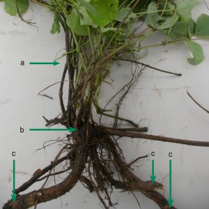 - Figure 3. Kudzu vines (a) originate from the root crown (b). The tubers (c) are storage organs found beneath the root crowns.
