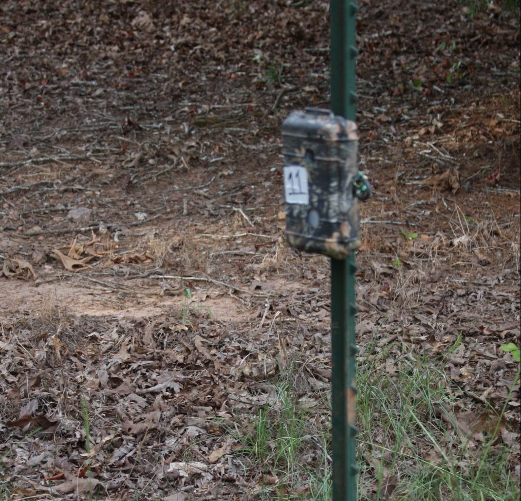 Place cameras strategically in areas of high deer activity, such as feeders, deer trails, scrapes, natural funnels, and water sources. Next, secure the camera to a tree or fence post located in the high activity area. Choose a tree at least 6 inches in diameter to limit false triggers associated with tree movement. A 6-foot t-post can be used if cameras are placed in areas where no other suitable objects are available for camera mounting.