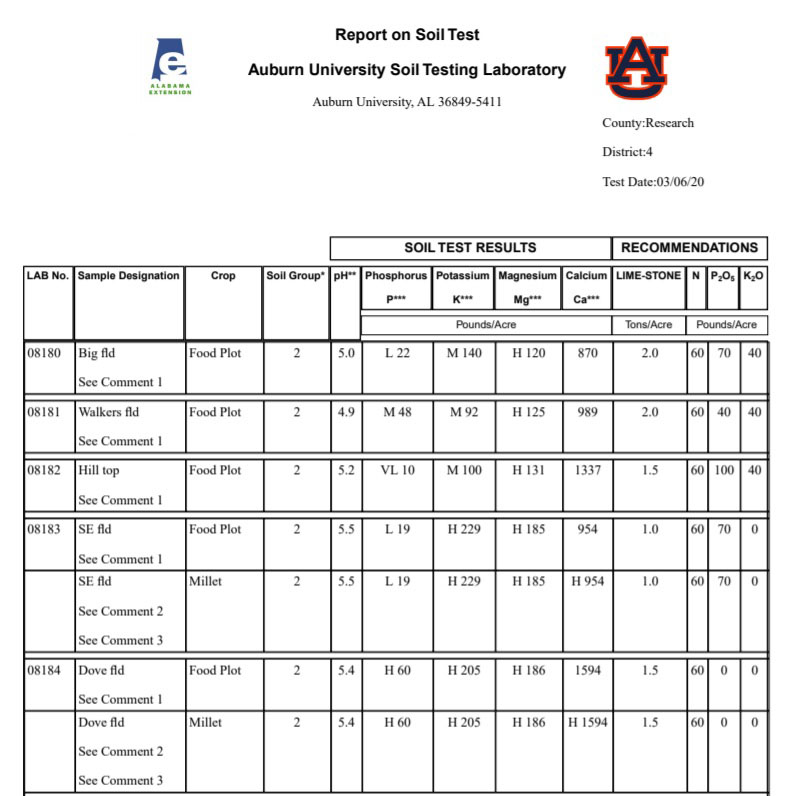 - Figure 1. An example of a soil test report from the Soil Testing Laboratory at Auburn University. Results show nutrient needs and recommendations based on soil samples taken from five food plot locations.