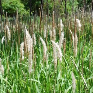 • Leaves are 1⁄2 to 1 inch wide and 1 to 5 feet tall. Leaf margins are finely serrated (rough). The leaves are often yellowish green (figure 2) with a whitish midrib that may be off-center, especially near the base of the leaves. Leaves turn a distinctive reddish tan color in winter (figure 3).