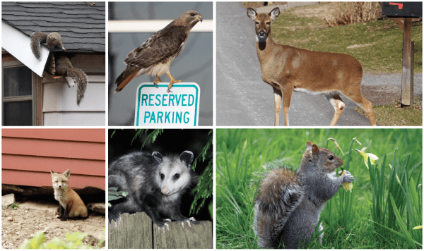 Top Left: While some species are content to live near you, others may try to live with you. Top Middle: Some birds of prey, such as this red-tailed hawk, can live within city limits. Top Right: White-tailed deer are common in some suburban areas. Bottom Left: Red foxes may live next to or under your house. Bottom Middle: Opossums are frequent backyard visitors. Bottom Right: A gray squirrel is a common sight in suburban backyards.