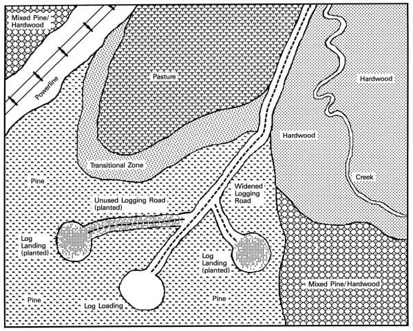 No precise rules govern the minimum amount or proportions of particular habitat types that must be available to turkeys. For example, turkeys may thrive on some areas with a low hardwood component if other areas, such as pine stands or food plots, are managed to meet or supplement fall and winter food needs (Figure 2).
