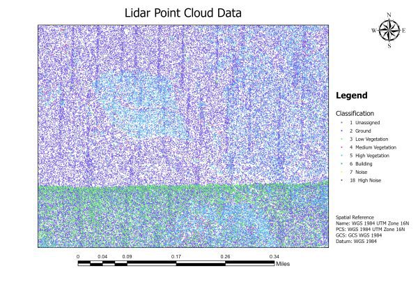 LiDAR, also called 3D laser scanning, is an active remote sensing system that employs laser signals to determine distances based on the time delay of the returned laser pulses. The emitted pulses travel to the ground, reflecting off objects such as buildings and tree branches. The reflected laser pulses are then captured by the LiDAR sensor and recorded. By measuring the time it takes for the emitted laser pulses to travel to the ground and back, the LiDAR system calculates the distance traveled. The distance traveled is then converted into elevation. The LiDAR system employs key components, such as a GPS, to determine the X, Y, Z location and an inertial measurement unit (IMU) that provides the platform’s orientation containing the sensor. By utilizing these parameters, it is possible to calculate the 3D position of the target object. The storage of LiDAR data typically involves using file formats such as .las and .laz. The .las and .laz file formats have high compression ratios, reducing the data storage space required. These file formats also support georeferencing, which is crucial for spatial analysis. Moreover, .las and .laz formats can store various types of metadata, such as point classification and color information, which can be used for further analysis.
