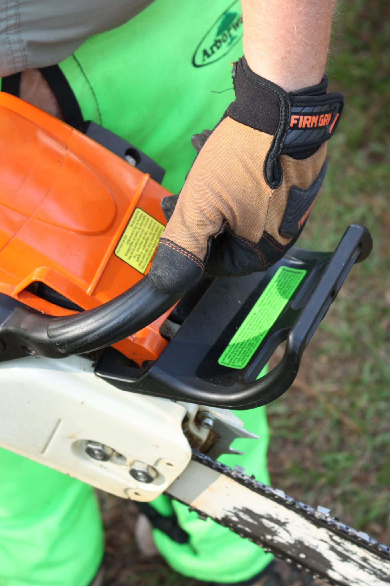 Always keep two hands on the saw when it is in operation. This position maximizes control of the saw and reduces chances of rotational kickback. Nearly half of all injuries occur on the left hand by operators holding a branch while cutting with the other hand. Fifty percent of injuries are preventable by always keeping two hands on the saw.