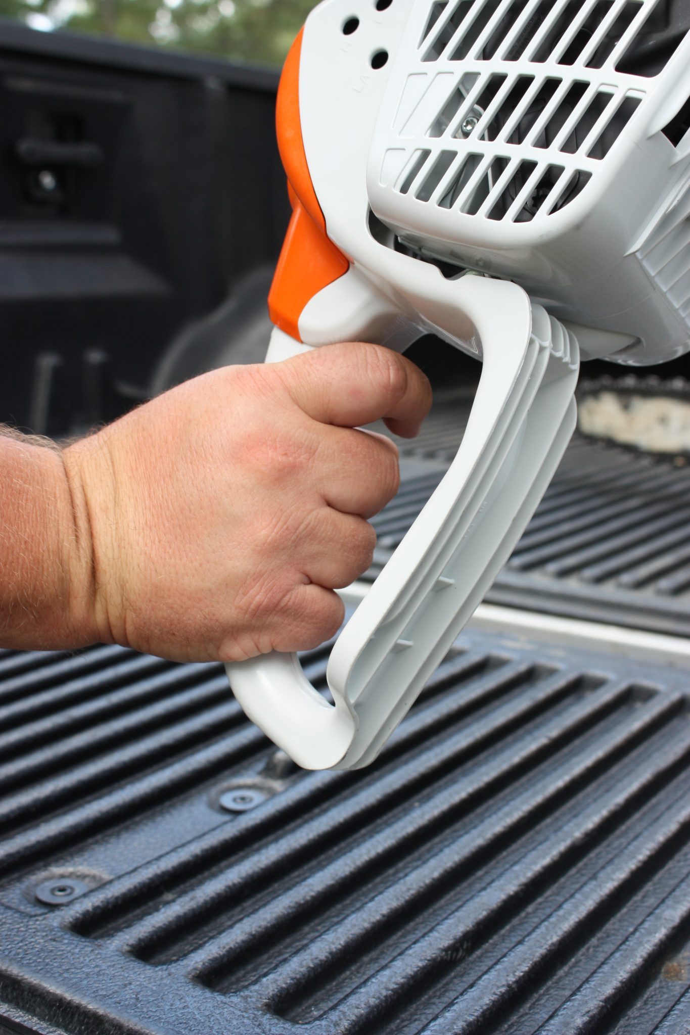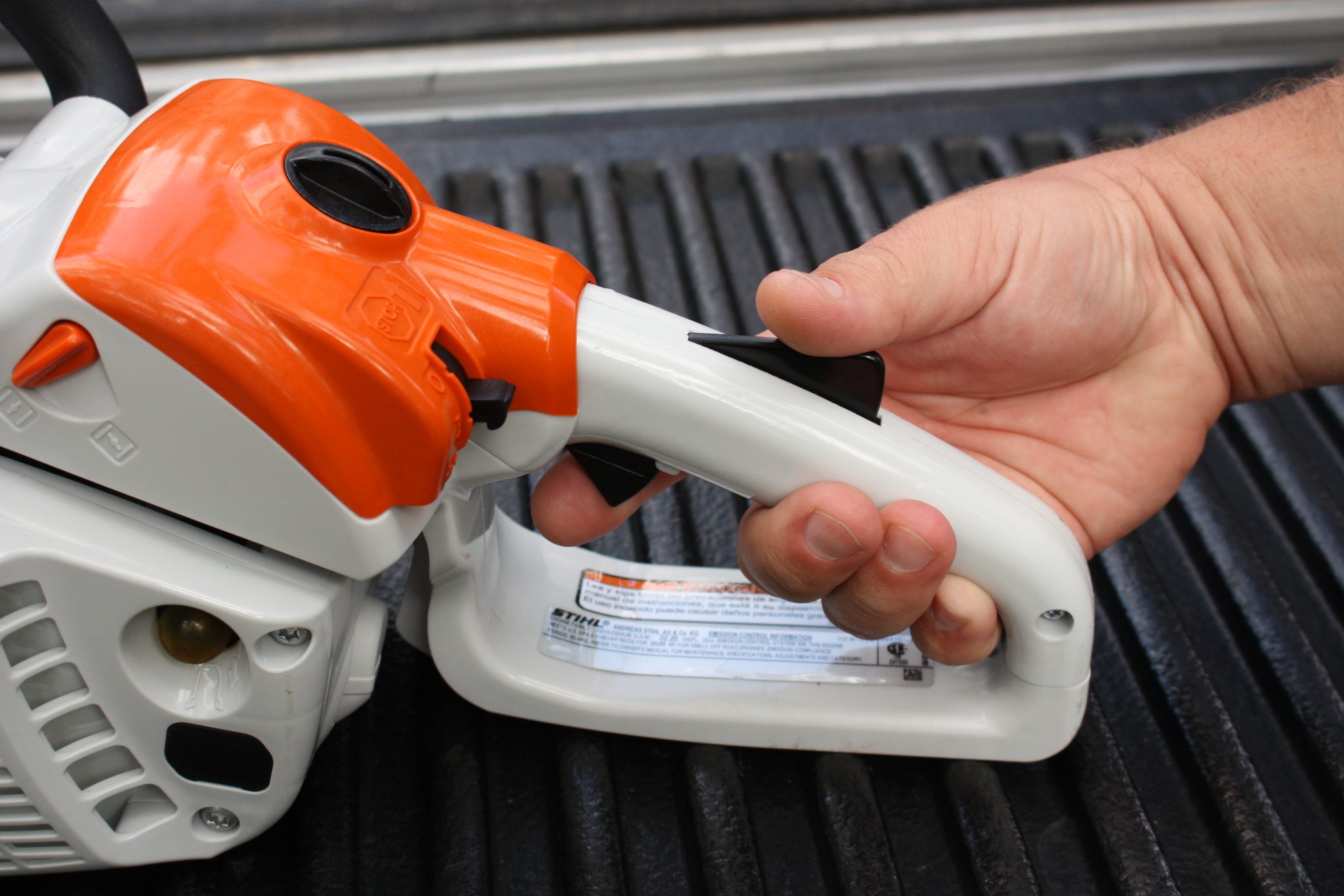 Trigger and Throttle Interlock. Located on the rear handle of the saw, the trigger and throttle interlock helps prevent the throttle button from being engaged until the interlock is depressed with the operator’s right thumb (figure 4). This prevents brush or a stick from inadvertently engaging the throttle when the operator is not ready.