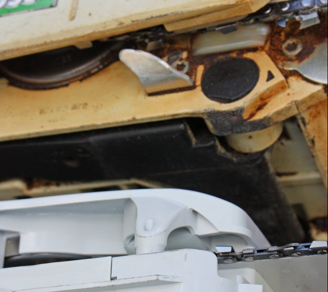 Chain Catcher. Constructed of metal or plastic, the chain catcher is found on the underside of the saw near where the chain enters the body of the saw engine housing (figure 3). The chain catcher is designed to catch and stop a chain that has broken or become disengaged with the guide bar. Ensure that this piece is fully intact and not worn down or broken before operating the saw.