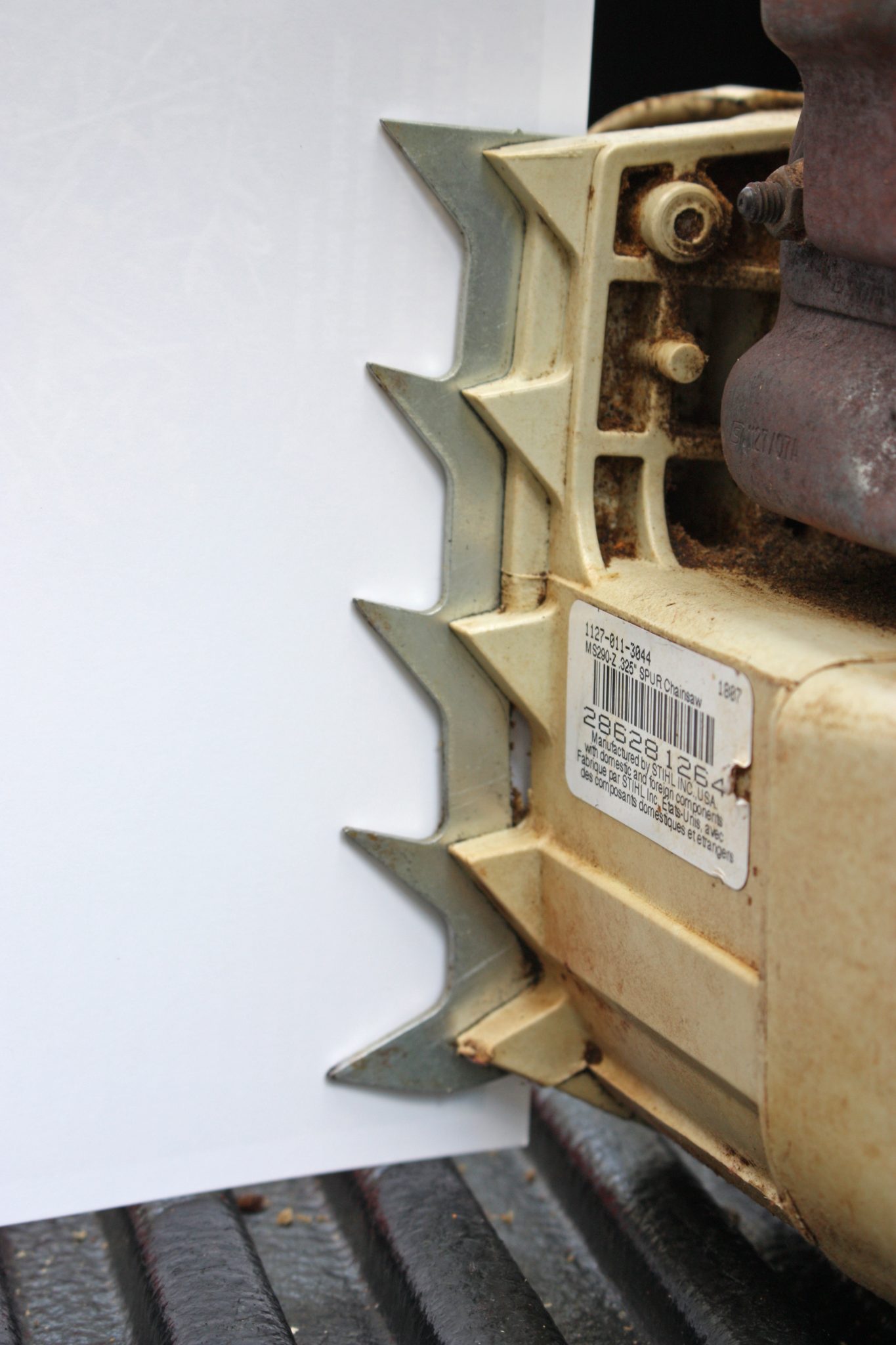 Bumper Spikes. Also referred to as felling dogs, these metal spikes are located where the guide bar meets the power head (figure 6). These metal spikes are designed to grip the wood and reduce rotational kickback or push-pull reactive forces. Bumper spikes should be in contact with the tree, when cutting, to maximize their effectiveness.