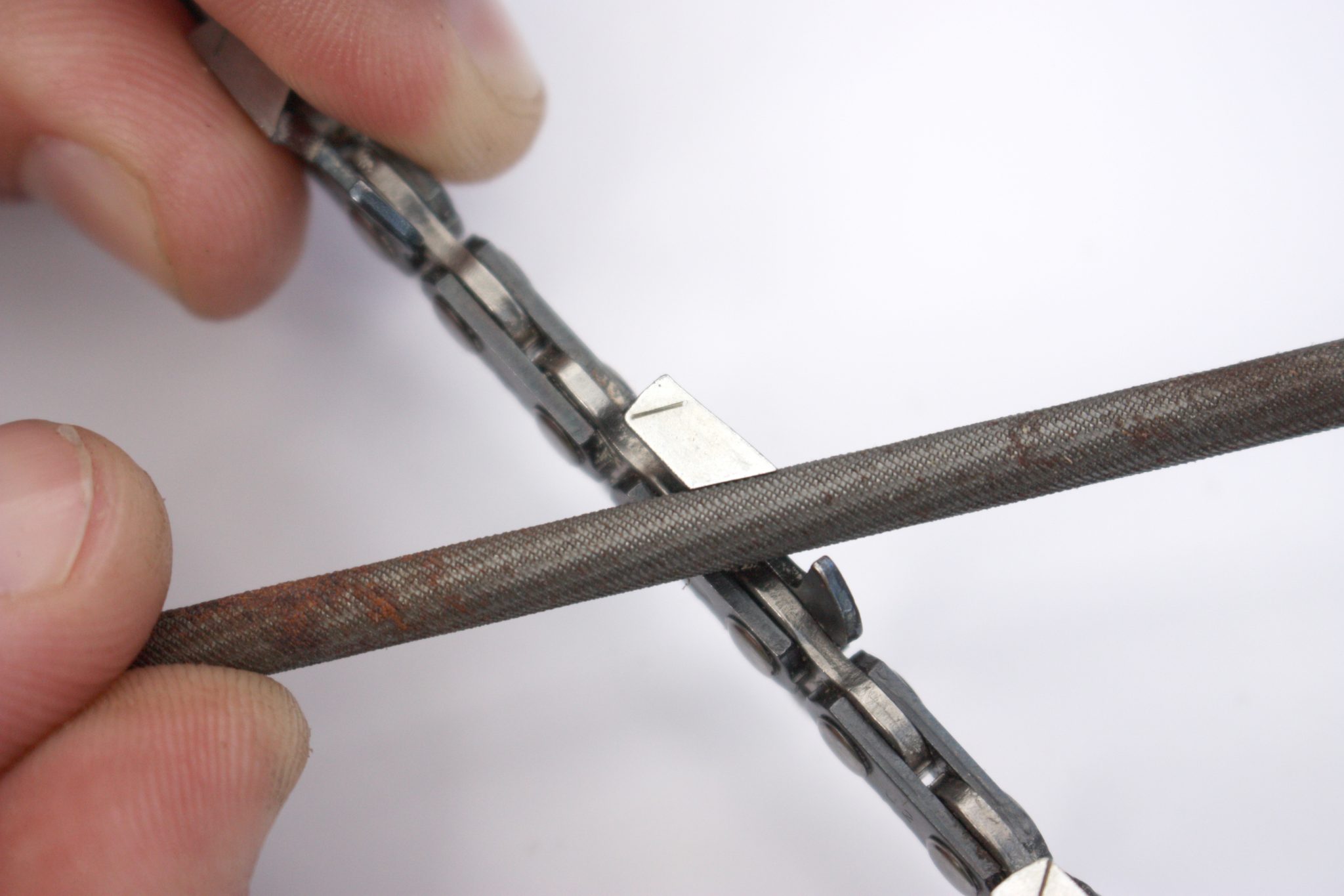 Chains should be sharpened to manufacturer’s guidelines and with the appropriate file size for the chain being used. Follow the filing angle side on the chain tooth and file the depth gauge as needed to ensure that the proper amount of wood is planed off when cutting (figure 9). Filing too much of the depth gauge will result in the tooth removing too much wood and binding up.