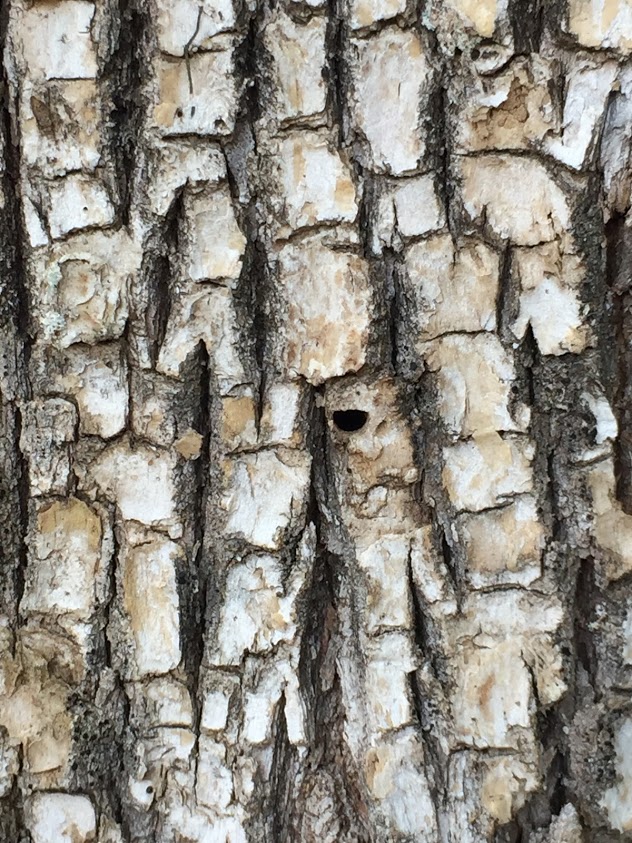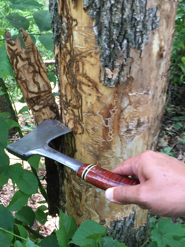 Once a suitable host tree is located, female EABs lay their eggs on the bark of ash trees. When the eggs hatch, the larvae chew their way into the cambium layer of the tree. Winding galleries caused by larval feeding within the cambium may cut off the transmission of nutrients to the upper portion of the tree, effectively girdling the host tree. If you are unable to see the classic larval gallery pattern of the EAB, you can sometimes see their D-shaped exit holes that the adults create as they chew their way out of the tree.