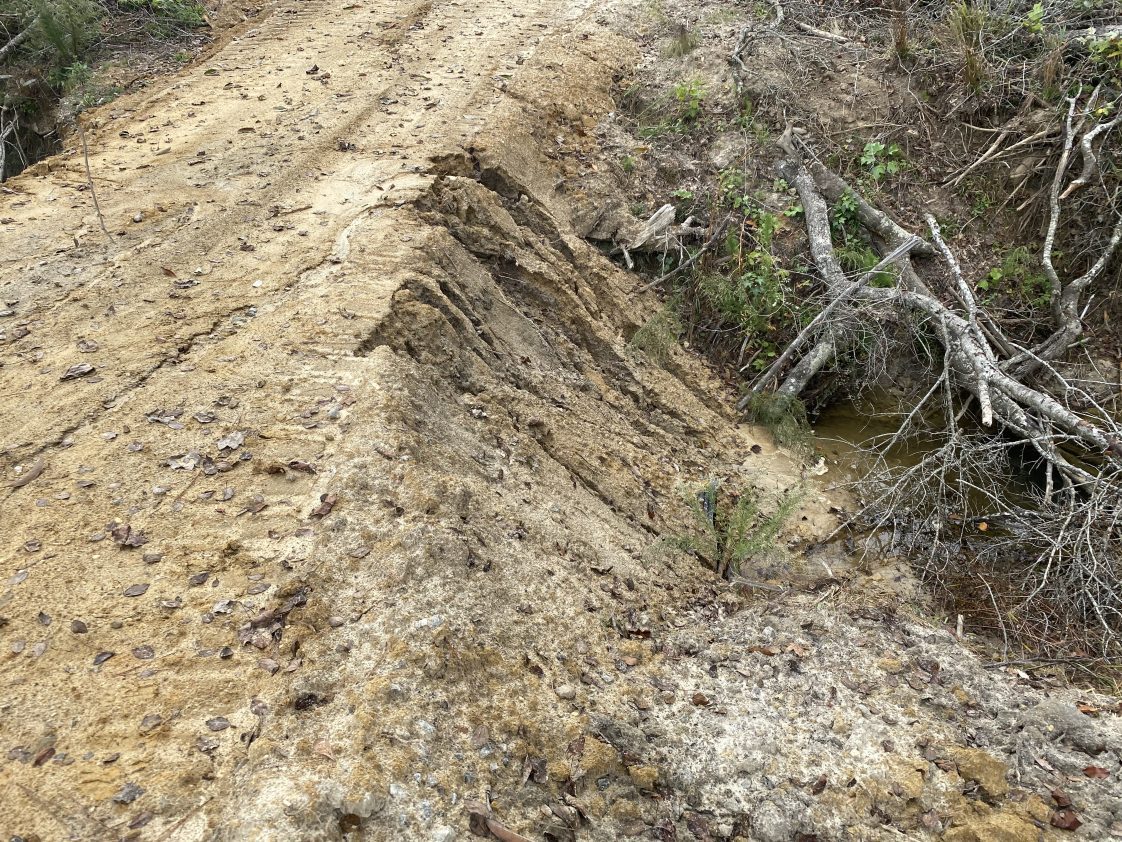 Figure 6. Permanent forest road culvert. Incorrect: Severe erosion on forest road stream crossing approach with erosion leading directly into the stream. This resulted in three issues: (1) water quality degradation from sedimentation, (2) washed out culvert, and (3) the need for significant road and culvert repair. No water diversion device or rock was applied on the stream crossing approach.