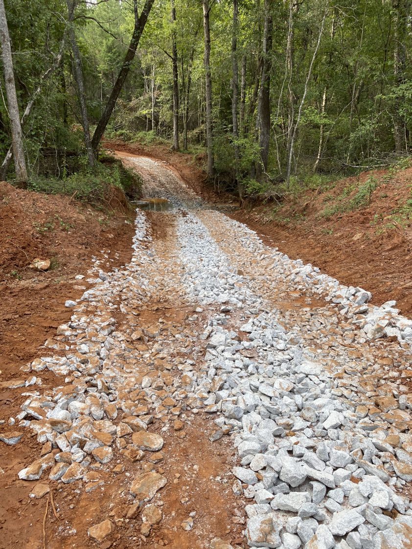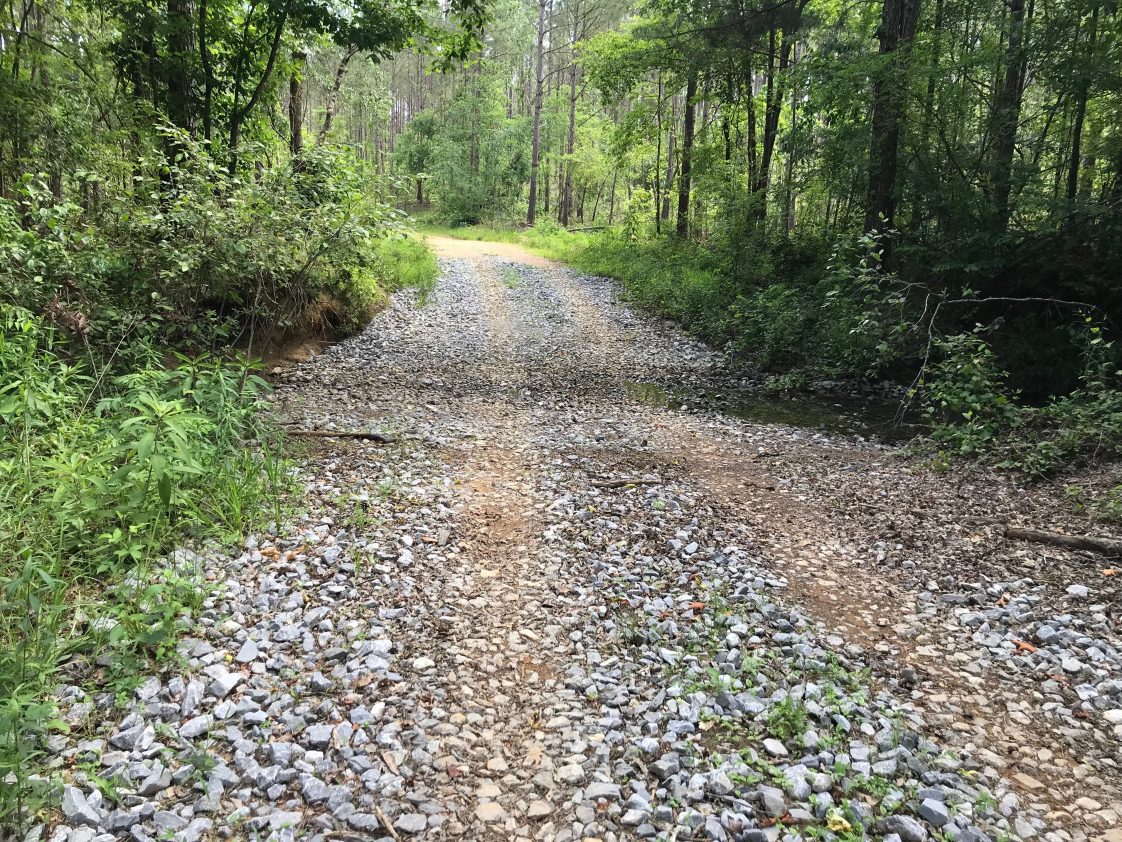 - Figure 9. Ford stream crossing. Correct: Use of large rock on forest road and stream crossing during wet-weather harvesting. However, it would be recommended to stabilize the roadsides with straw, hay, or additional rock.