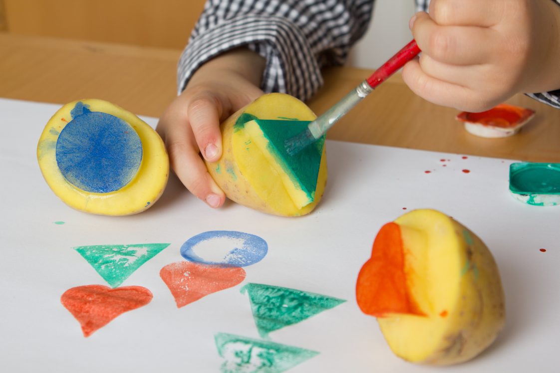 - Stamping with homemade vegetable stamps or sponges of different shapes from the kitchen—be sure to put down a plastic tablecloth.