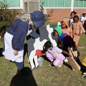 Merri Robinson, Barbour County Extension administrator, Sam Williams, and Keisha Russaw with the Alabama Power Service Organization, used Sally, a wooden cow, to teach students about dairy farming. Each student participated in a hands-on milking demonstration and received milk for their lunch.