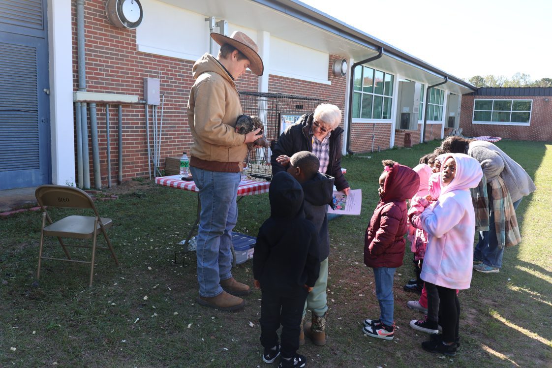 4-H volunteer Bonnie Martin and 4-H member John Puckett gave a lesson on poultry and egg production, showing how chickens produce eggs of various colors. Students interacted with live chickens, adding a fun, hands-on element to the station.