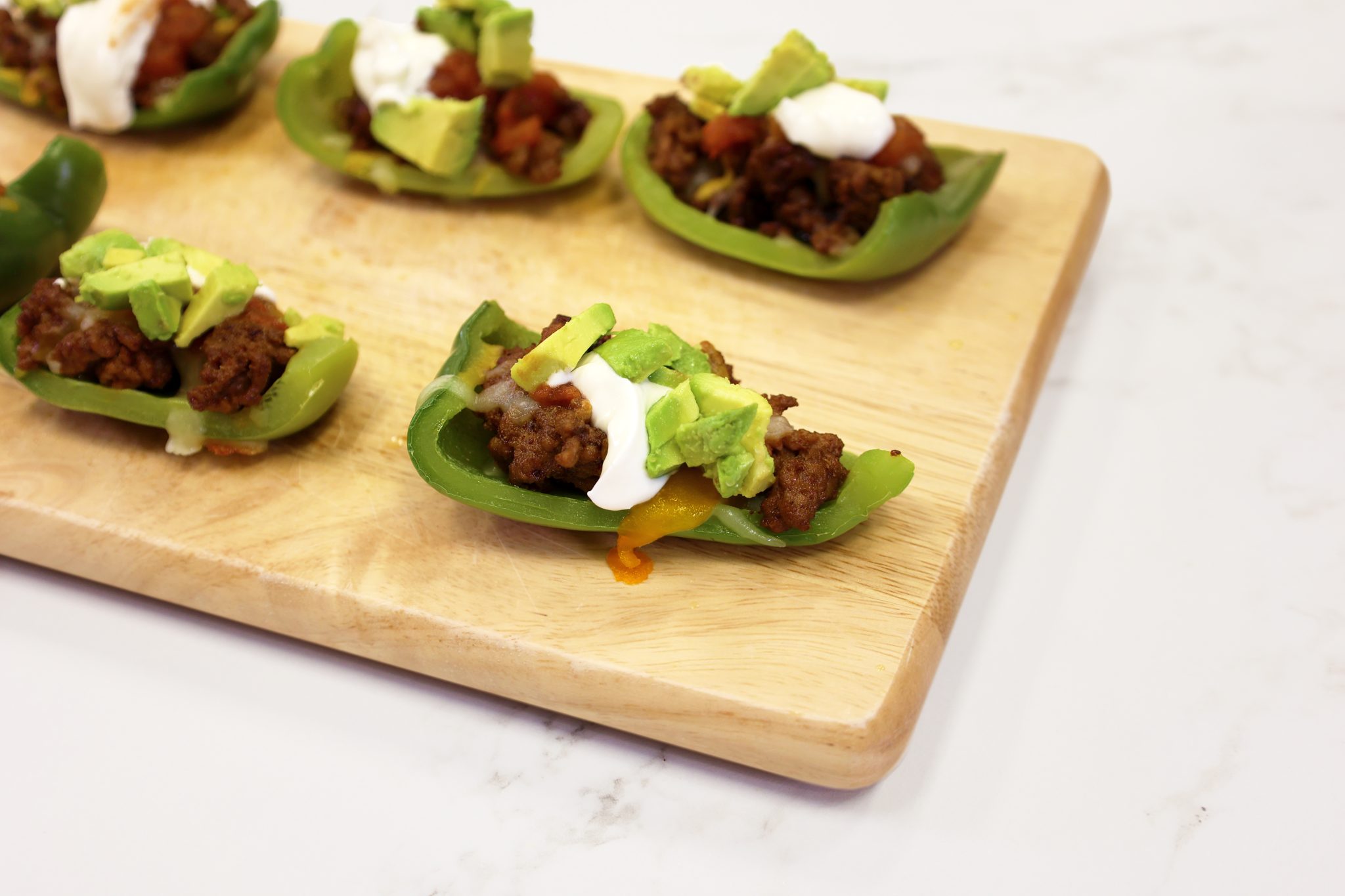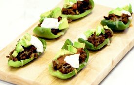 - Spoon some meat mixture onto each pepper piece. Sprinkle with cheese and broil until cheese melts. Top with guacamole, salsa, and sour cream.