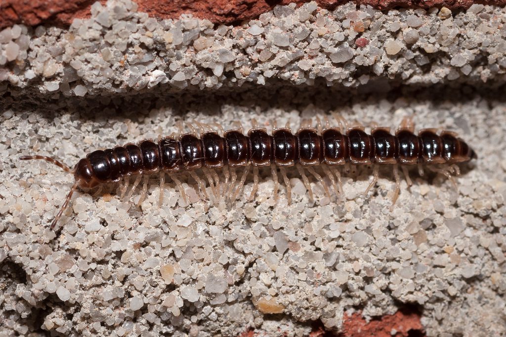 In Alabama, the most troublesome home invader is the garden millipede, Oxidus gracills, also named the greenhouse millipede. Garden millipedes have a flat body, brown to black in color, and are about ½- to ¾-inch long, smaller than other millipede species. In addition to decaying organic materials, they also feed on seeds and live plants when no other food is available and become a pest in greenhouses.