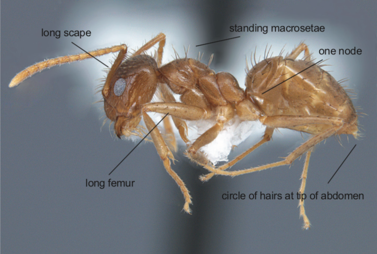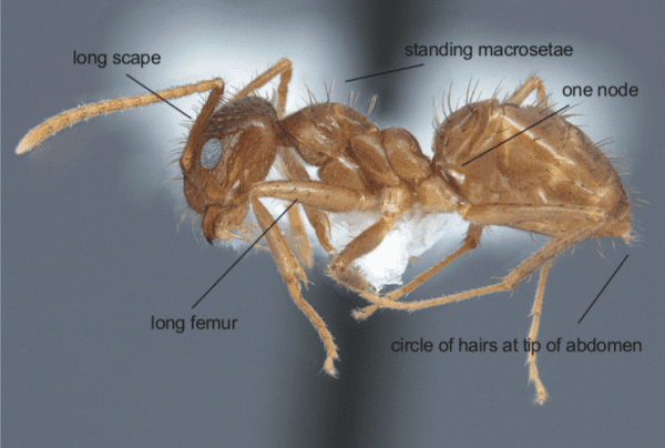Trails of TCAs are fast moving, erratic, wide, and have vast numbers of ants. They do not form mounds in the landscape but can tunnel in loose soil. TCAs are uniformly sized, reddish-brown in color, and 1/8-inch long. Worker ants have long legs and antennae. Under a microscope, you will see a 12-segmented antenna, a petiole with one node, an acidopore, and a body covered with many hairs (figure 1).