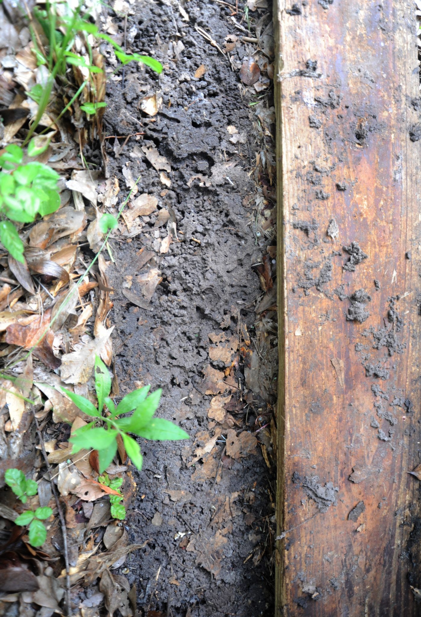TCAs prefer foraging and nesting in shaded areas. Foraging trails are quite apparent (approximately 4 inches wide), and individuals forage erratically. Foraging trails often are found going up and down trees and fences, following seams in concrete surfaces, following structural barriers, and moving in large, open, shady, grassy areas (figure 3). Colonies nest in, on, and under anything that can provide moisture and protection from rainfall. They are found in mulch and leaf litter; under pots, natural debris, landscape objects, and loose tree bark; and in signs and structures (figure 4). Nests occur primarily outdoors, but worker ants will forage indoors.