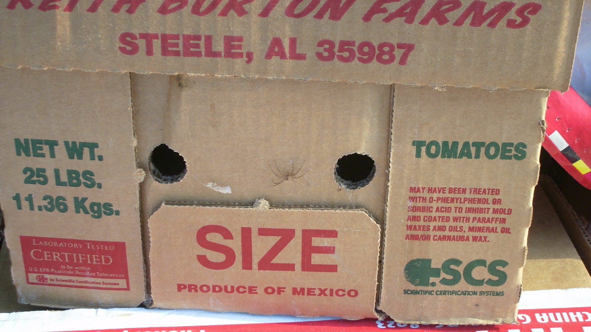 Figure 4. A good example of a brown recluse’s flat web in the corner of a stored box. Note the dead brown recluse inside the box. (Photo credit: Amber C. Marable)