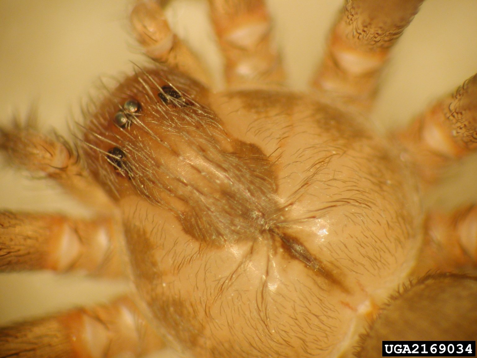 The brown recluse spider belongs to a group of spiders commonly known as the “fiddle-back” or “violin spider” because of the violin-shaped marking on the dorsal surface of the cephalothorax (fused head and thorax) with the neck of the violin pointing toward the abdomen (figure 1). The shape and intensity of the fiddle design may vary. A more definitive diagnostic feature is the eye pattern on the front of the cephalothorax—six eyes arranged in three pairs in a semicircle pattern with a space between each pair (figure 2). Most spiders have eight eyes.