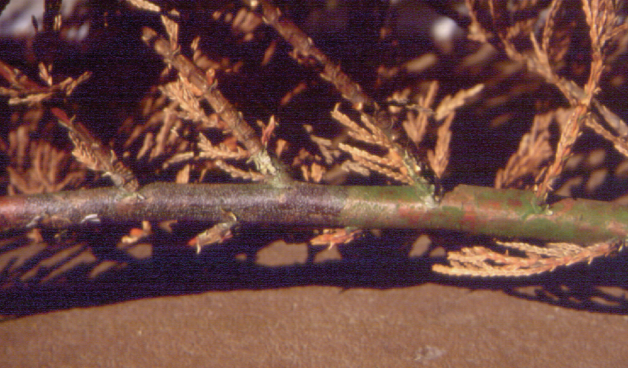 Figure 1. Yellowed foliage on branch of Leyland cypress damaged by Seridium