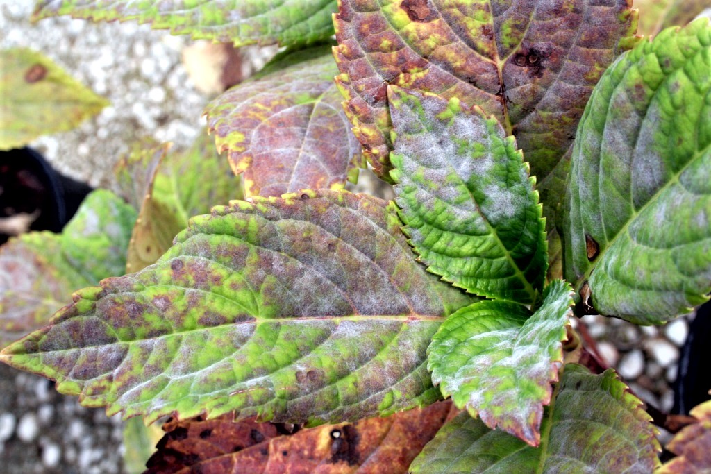- Figure 3. Extensive leaf discoloration associated with heavy powdery mildew colonization of leaves of ‘Nikko Blue’ bigleaf hydrangea.
