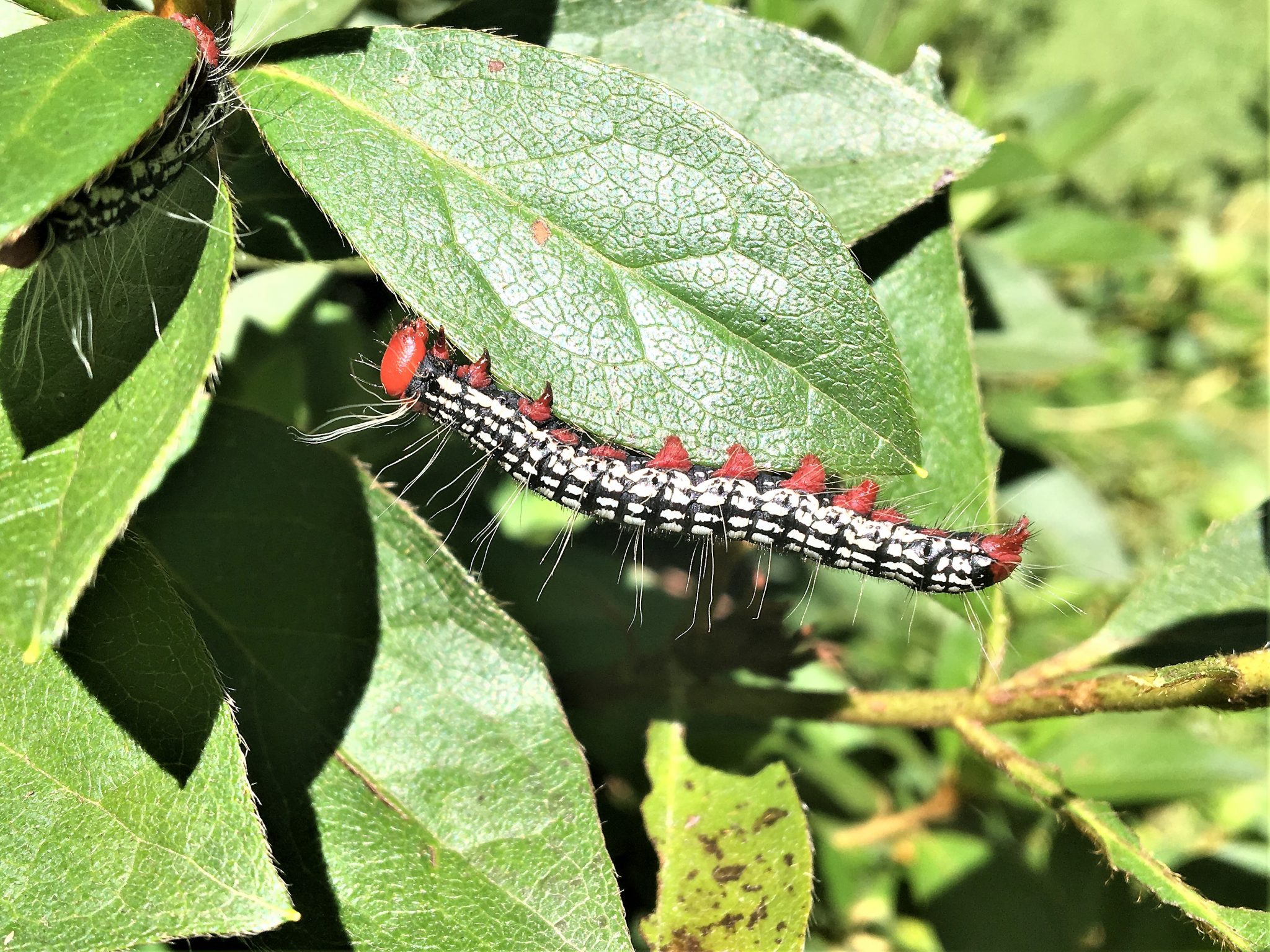 Azalea caterpillars are colorful, hairy insects capable of completely defoliating azalea plants, especially large-leaf Indica varieties. The full-grown caterpillars are approximately 2 inches long with a reddish head and black body featuring rows of yellow or white spots and white hairs. The immature caterpillars are red to brownish black with white to yellow stripes and are about 1⁄2-inch long.