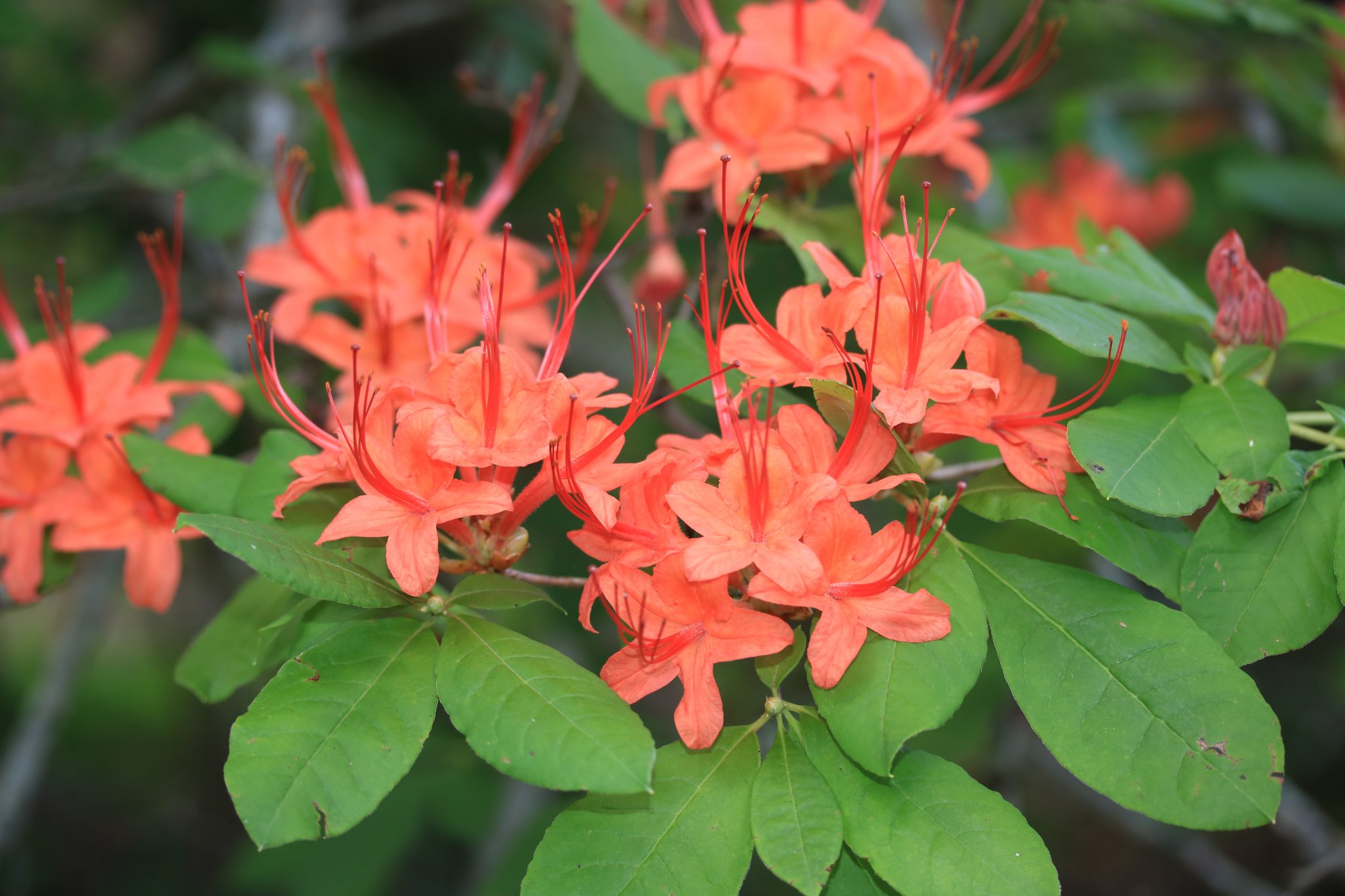 (Rhododendron cumberlandense) has nonfragrant orange to red flowers that open in May to early June. It is native