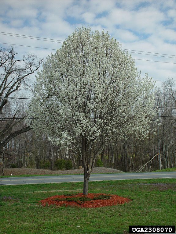 Callery pear (‘Bradford’ pear) (Pyrus calleryana Decne.) (Photo credit: Chuck Bargeron, University of Georgia, Bugwood.org)