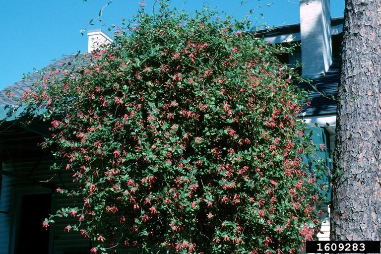 Coral honeysuckle (also called trumpet honeysuckle) is a native evergreen honeysuckle that grows up to 20 feet tall (figure 37). Plant it to climb a fence or arbor (figure 38). Coral honeysuckle is one of the showiest, most reliable native vines for the home landscape, adapting to a wide range of soils. It attracts hummingbirds. Coral honeysuckle blooms on the previous year’s growth, so prune after flowering is done in the summer. It roots easily from softwood cuttings. It can also be propagated by layering or seeding after a 3-month stratification period. Do not confuse this native honeysuckle with the more aggressive and invasive Japanese honeysuckle, Lonicera japonica.